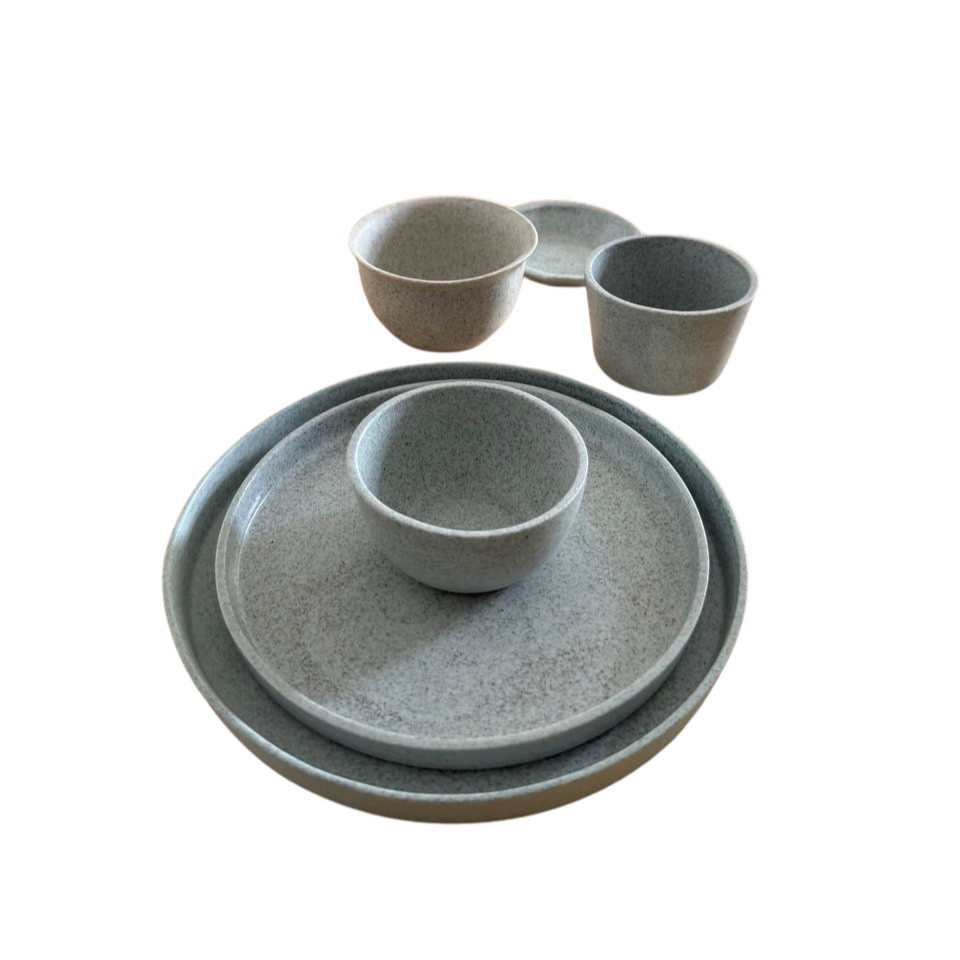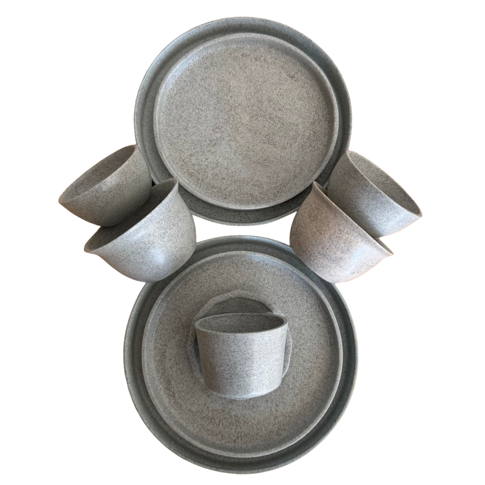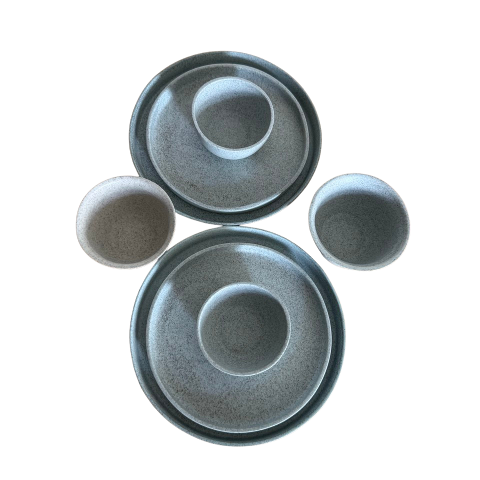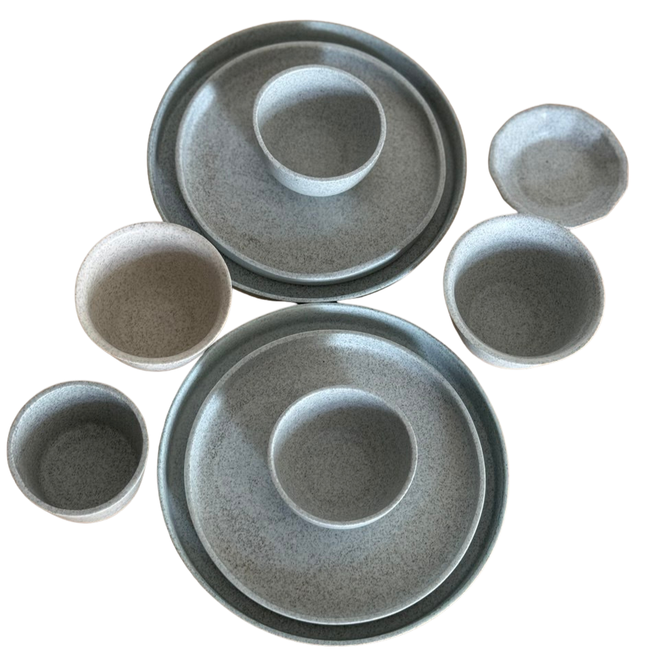 Set mat sır ile sırlanmış olup, krem, açık mavi ve açık yeşilin tonlarını yansıtmaktadır.